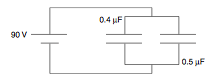 Two capacitors, 0.4 μF and 0.5 μF are connected in parallel and charged to a 90 V potential difference.