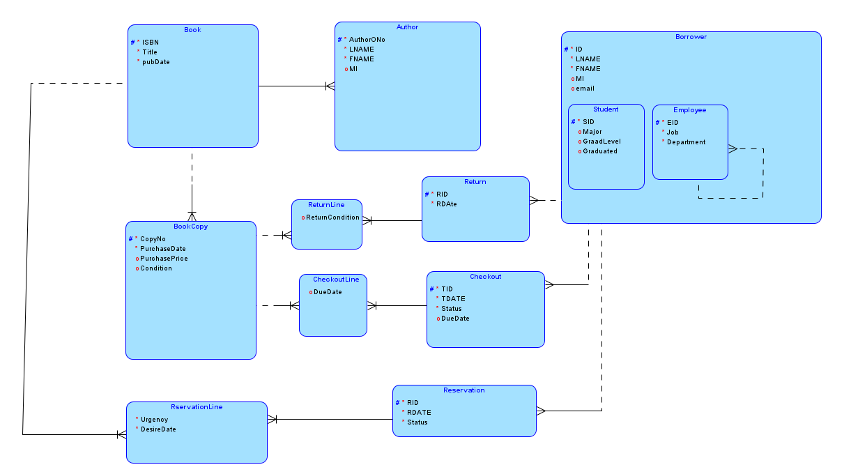 Members (MID, Lname, Fname, Phone, Address, State, City, Zip, Student, Professor) Students (SID, Major, AdmissionDate, Faculty_Advisor) Professors (IID, Department, Area) Memberships (Member, Number, ExpirationDate) Events (Name, Time, cost, place, Followup_Event, Followup_Time) Signups (member, Event, time)
