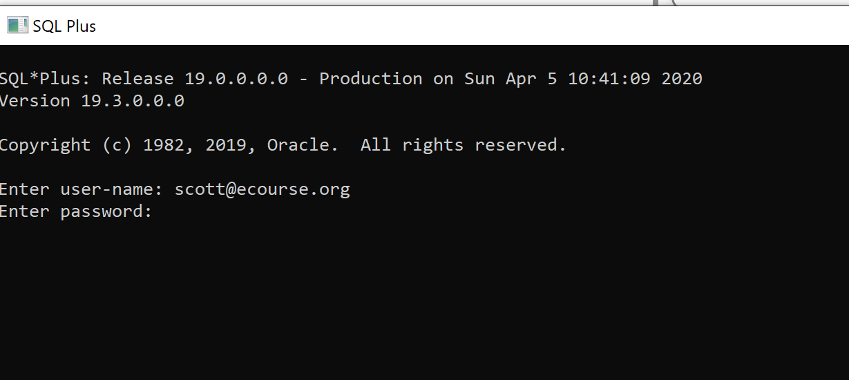 • To test the installation, run CMD from windows Start button and type sqlplus to run SQLPLUS. Type scott@COB19C as user and tiger as password to see if you can login.
