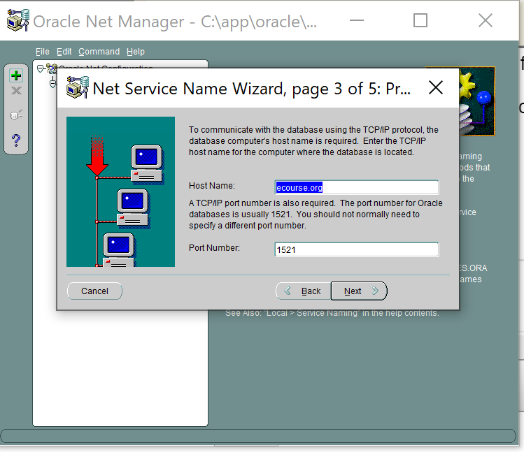 8. Press Next and enter ecourse.org as Host Name and 1521 as port number (see below)