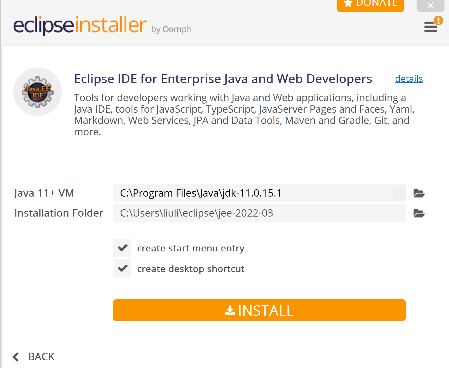 If you already have JDK installed, the setup will show the existing JDK for Java VM. Otherwise, select a version of JDK to install as prerequisite for Eclipse installation. Since we choose to install IDE for Enterprise Java, additional EE files will be installed in Installation Folder. Press Install button and accept Eclipse Foundation license agreement to continue.