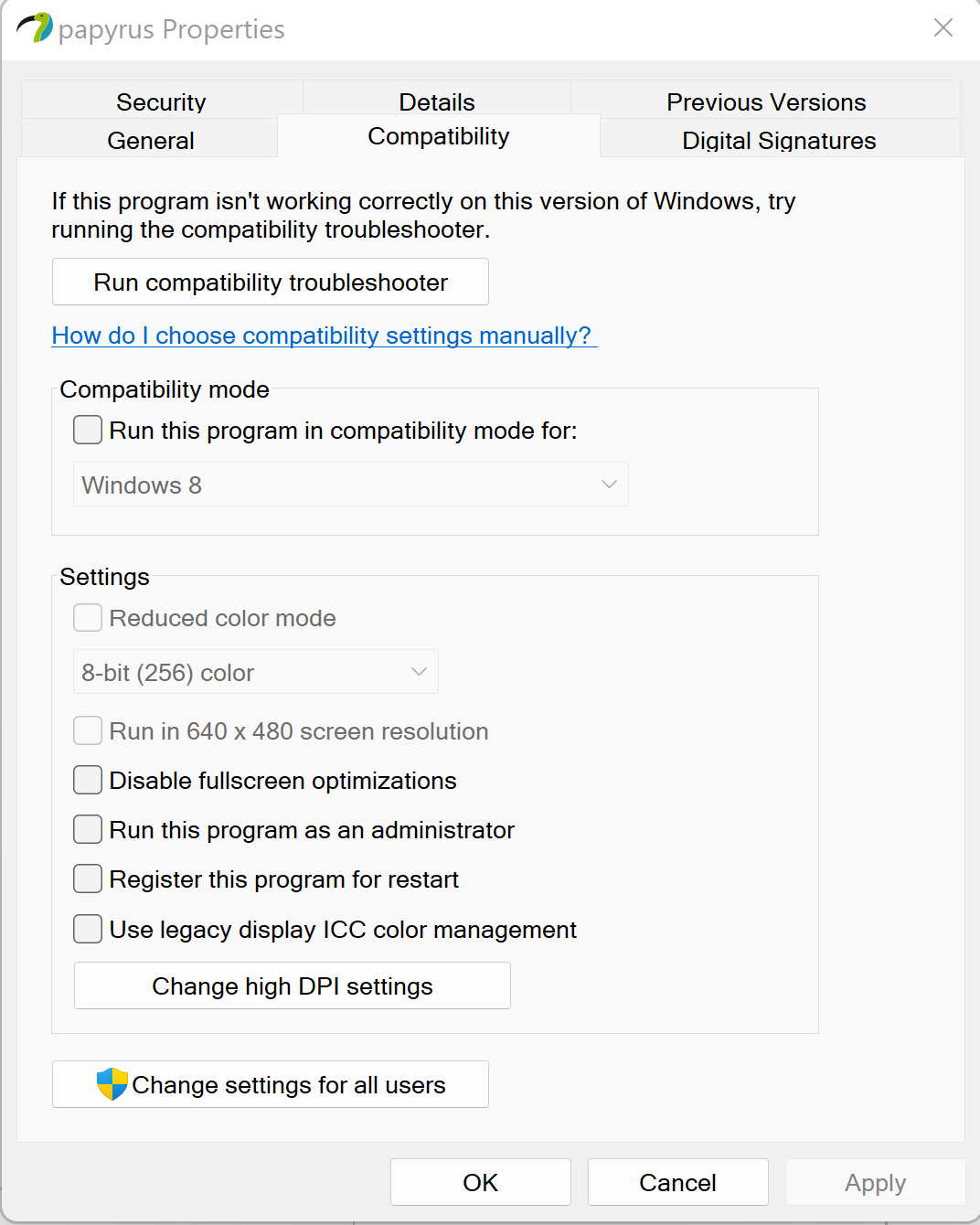 - If you have high resolution monitor and see the fonts too small, you can fix it by adjusting high DPI settings. Again, right-mouse click on papyrus.exe file inside the extracted folder and choose Properties. Then click on Compatibility tab (see below)